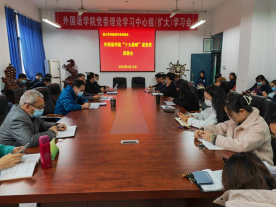 4月14日,外国语学院在7211会议室召开“十大战略”进党校部署会。学院党委书记张忠迪,院长李会民,党委副书记龚俊朋,副院长万文龙、程建锋和全体教职工党员参加了会议。会议由李会民主持。