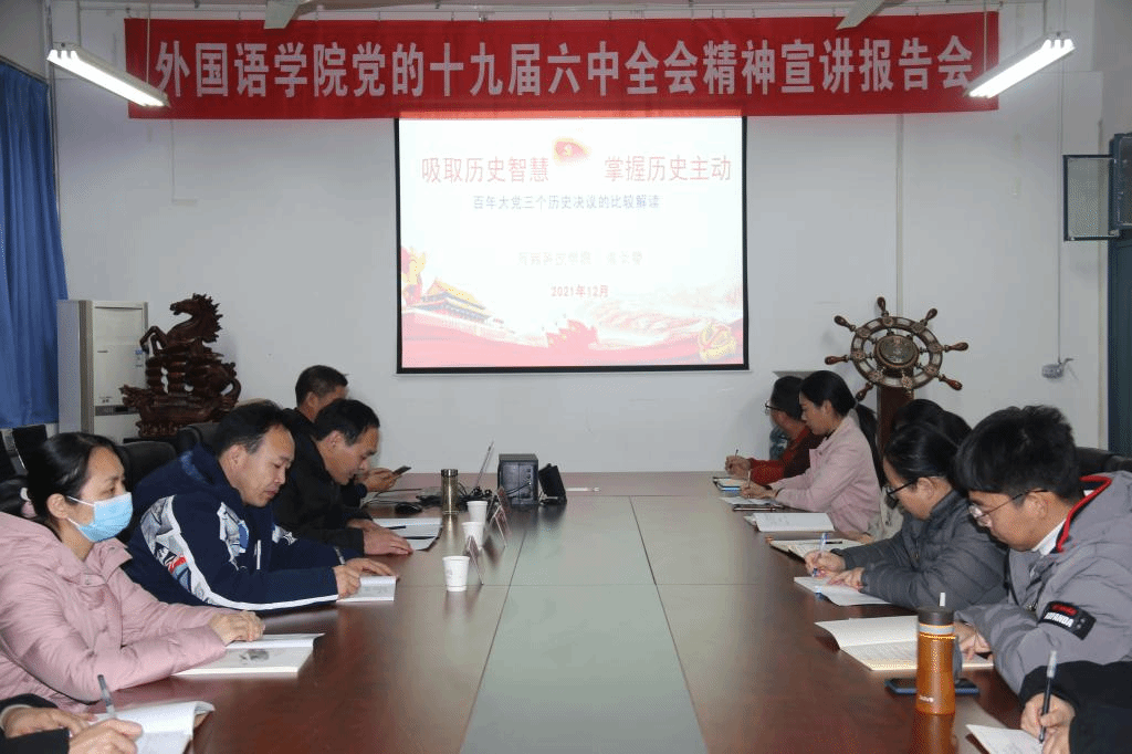 为学习贯彻十九届六中全会精神,推进党史学习教育,12月15日晚,外国语学院召开党的十九届六中全会精神宣讲报告会,院党委书记张忠迪、党委副书记龚俊朋、团委书记张高峰及师生党员代表70余人参加会议。会议由张忠迪主持。