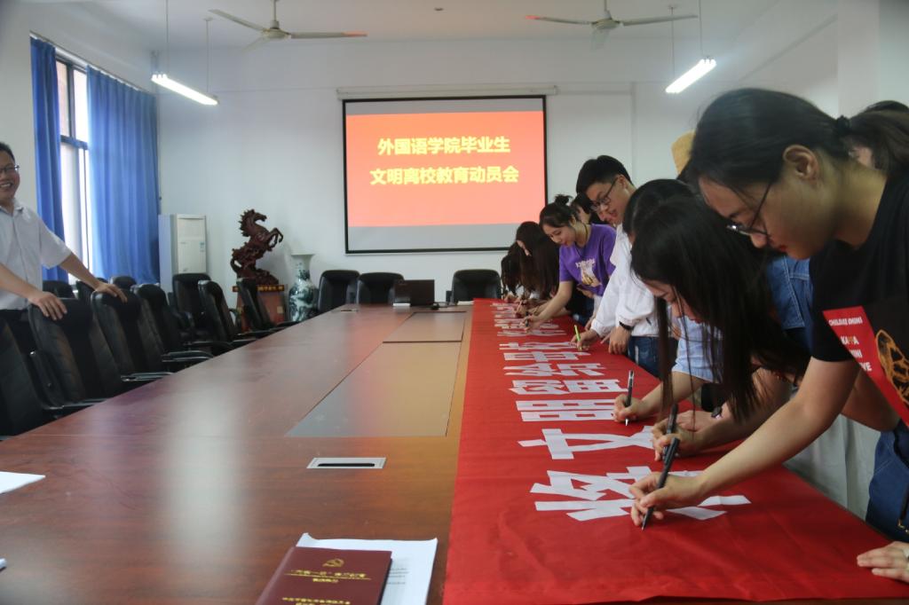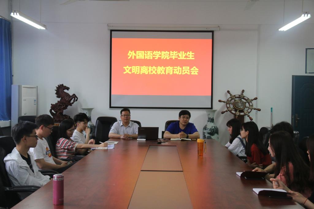 为做好2019年毕业生教育和离校工作,根据学校《关于做好2019年毕业生教育和离校工作的通知》。5月15日下午,外国语学院毕业生文明离校教育动员会在7211会议室召开。外国语学院团委书记张高峰,辅导员时文鹏及15级全体班委参加动员会。