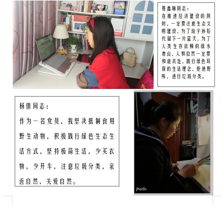 各支部书记认真筹划,准备相关学习材料,通过支部微信群分享到每位党员。活动中,组织支部党员深入学习了习近平总书记在统筹推进新冠肺炎疫情防控和经济社会发展工作部署会议和全国生态环境保护大会的重要讲话精神,梳理了习近平总书记关于生态文明建设的重要论述,号召广大党员同志自觉提高思想认识,做到倡议中提到的“八个带头”,加强学习环保理念知识,杜绝乱丢垃圾和食用野生动物的陋习,逐步养成文明健康、绿色环保的生活方式。