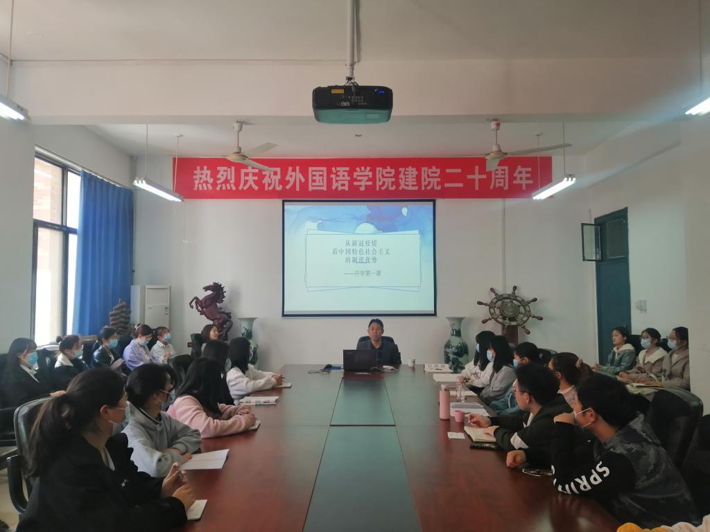 为加强新时代爱国主义教育,使学生全面认识中国特色社会主义制度优势,3月23日,外国语学院院长李会民以“从新冠疫情看中国特色社会主义的制度优势”为主题,为同学们讲授了“开学第一课”。