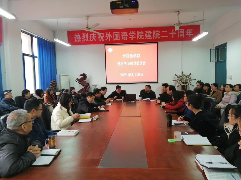 3月18日下午,外国语学院在7#211会议室召开党史学习教育动员大会,深入学习贯彻习近平总书记在党史学习教育动员大会上的重要讲话精神,学院党委书记徐兆栋,院长李会民,副书记龚俊朋,副院长万文龙、程建锋等领导出席会议,全体教职工参加会议。