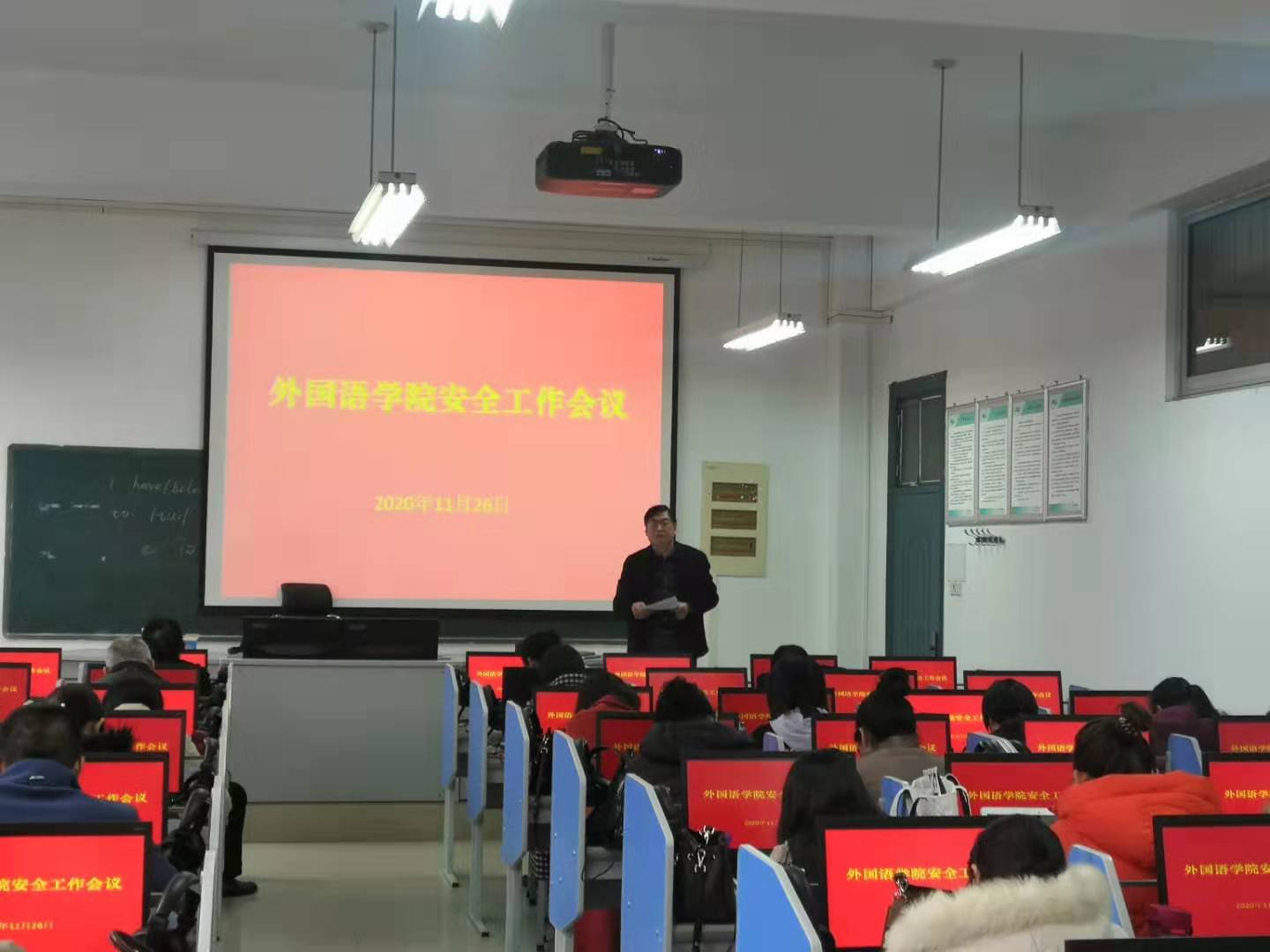 为持续推进安全教育管理,进一步提高师生安全防范意识,全面传达11月16日和23日学校召开的2020年平安建设暨消防安全工作会议和实验室安全工作会议精神,外国语学院于11月26日下午在7号教学楼408教室召开安全工作会议。学院领导徐兆栋、李会民、龚俊朋、万文龙、程建锋出席会议,全体教职工参加会议。