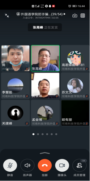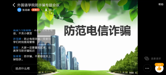 新学期伊始,电信诈骗再次抬头,为提高同学们的防范意识。9月2日中午,外国语学院通过钉钉召开大学生防电信诈骗专项教育活动。学院党委副书记龚俊朋,团委书记张高峰、副书记时文鹏出席,学院团委、学生会骨干成员参加活动。