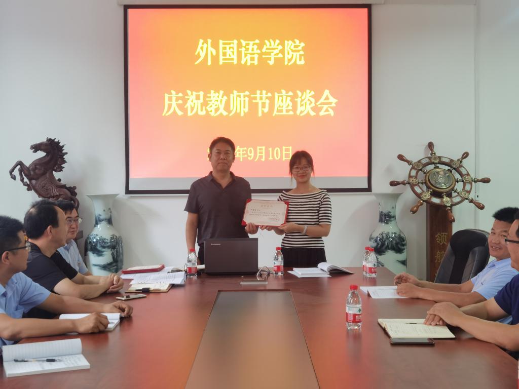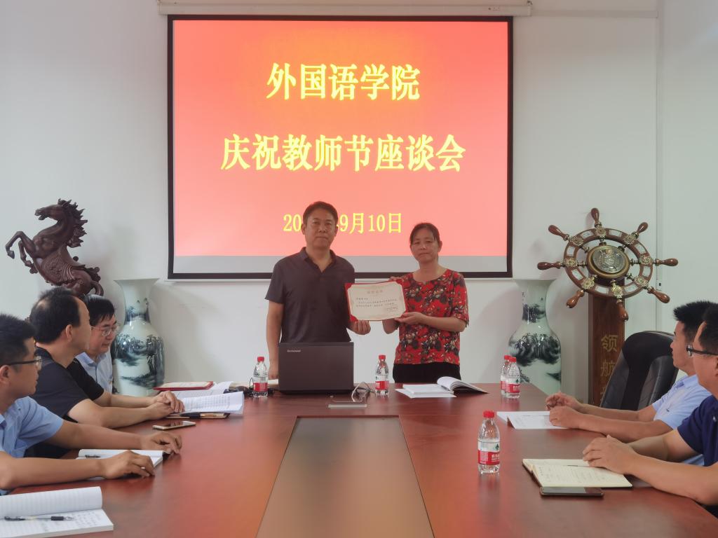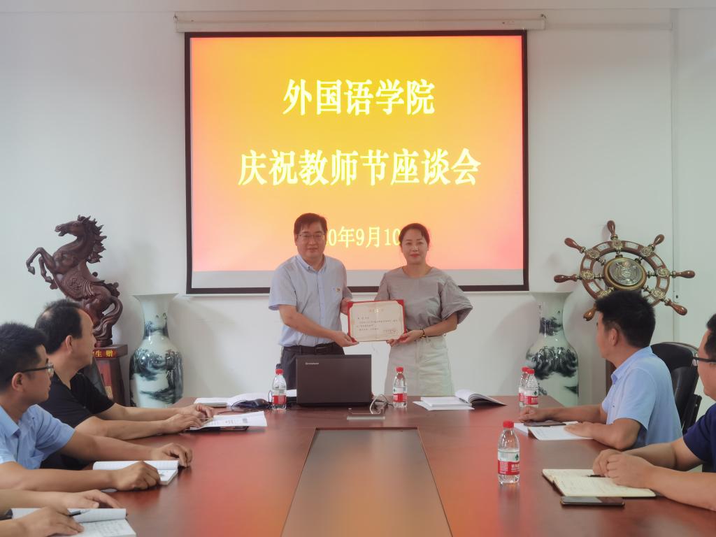 在7号教学楼211会议室,外国语学院召开了庆祝教师节座谈会,学院党政领导班子、教师代表参加了座谈会。座谈会由党委书记徐兆栋主持。会上,院长李会民宣读了河南科技学院党委书记周志远、校长李成伟致全校教师的慰问信,并同徐兆栋一起为“科院最美教师”、“优秀教师”颁发了证书。徐兆栋在讲话中希望受表彰的教师勿忘立德树人的初心,牢记为党育人、为国育才的使命,充分发挥示范带头作用,珍惜荣誉、再接再厉、再立新功。座谈会中,大家踊跃发言,围绕学科专业建设、教学科研、研究生教育、实验室建设、团学工作及学生就业等方面为学院发展提出了宝贵的意见。