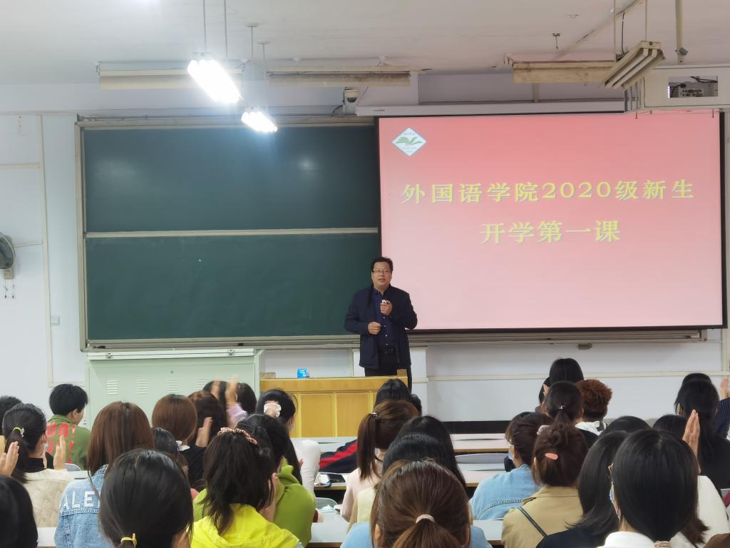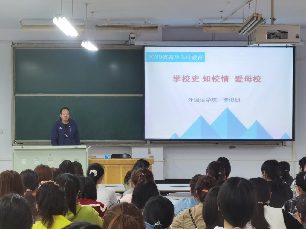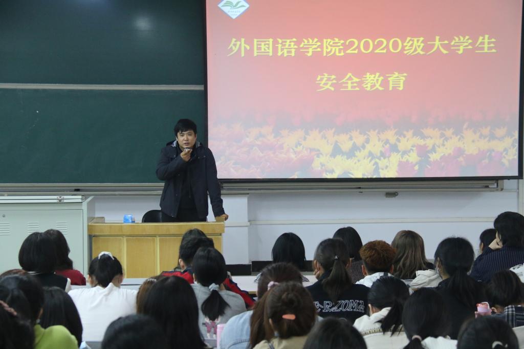 10月11日上午,外国语学院在10#合二教室召开2020级新生入学教育大会。学院党委副书记龚俊朋,团委书记张高峰、副书记时文鹏及2020级新生参加大会。团委书记张高峰主持大会。