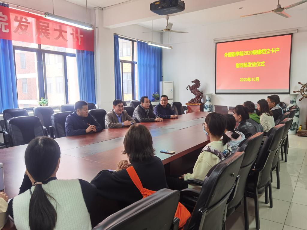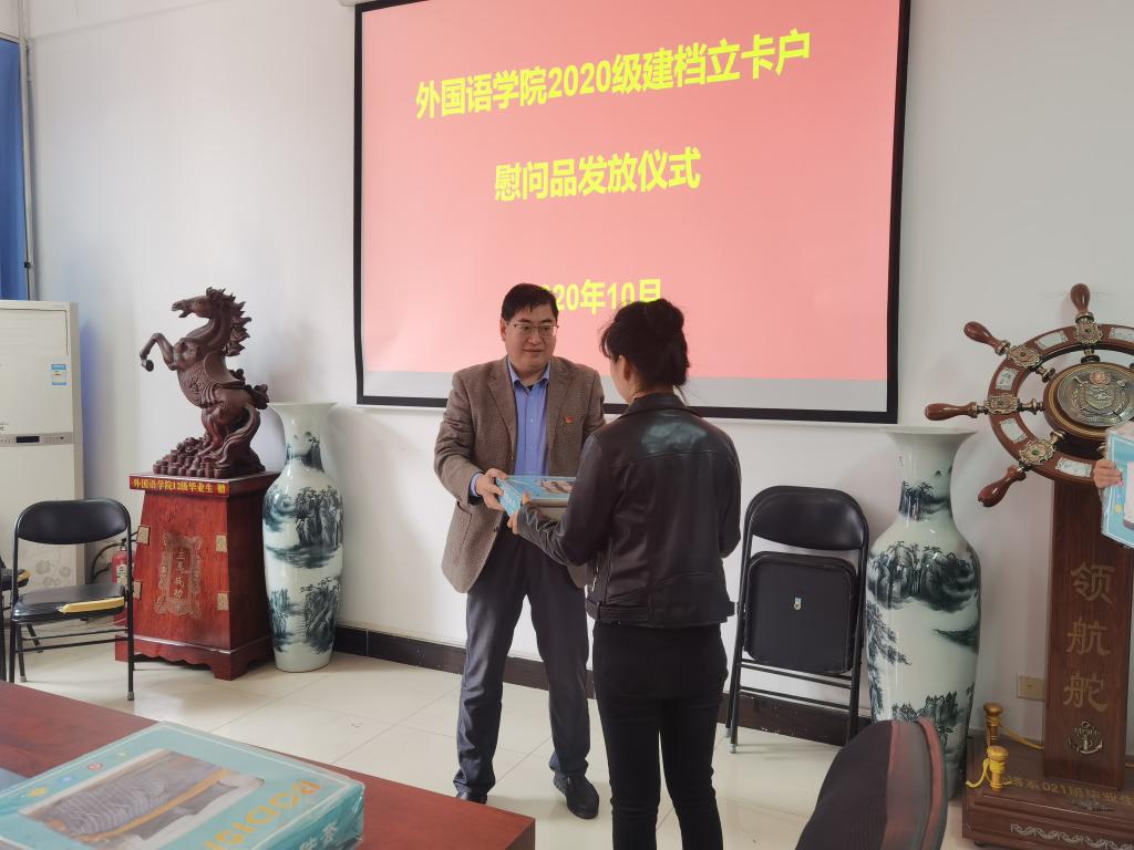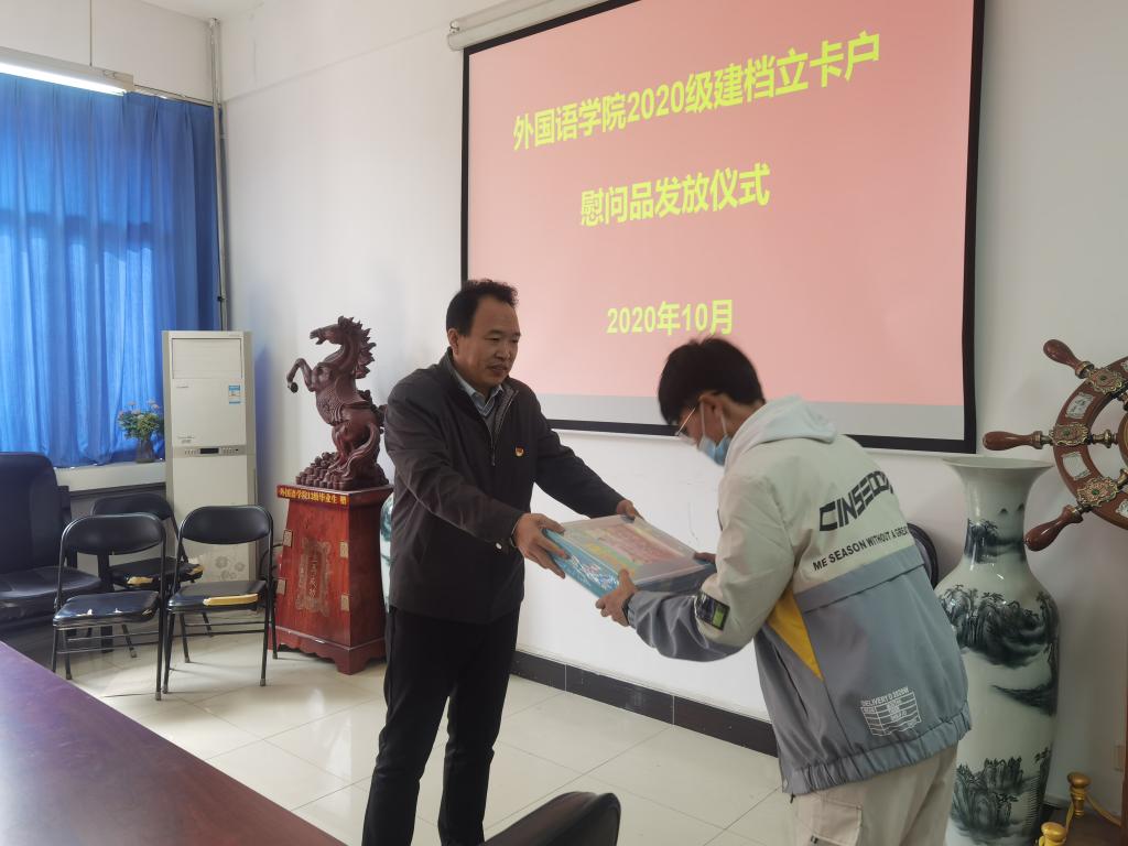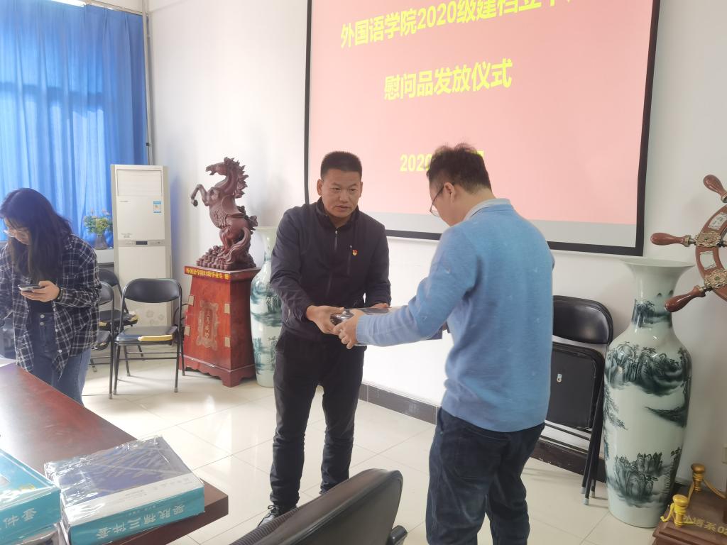 为切实帮助2020级贫困学生,根据学生处要求,10月17日外国语学院在7#211会议室举行了2020级贫困生慰问品发放仪式,院党委书记徐兆栋、副书记龚俊朋,副院长万文龙,团委书记张高峰、副书记时文鹏及全体受资助学生参加发放仪式。