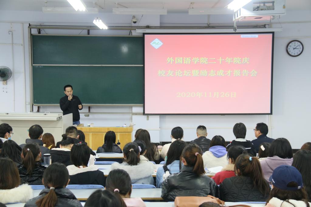 11月26日下午,外国语学院在10#合三教室举行二十年院庆校友论坛暨大学生励志成才报告会。外国语学院2004届优秀校友、东莞市迪兰实业有限公司总经理李海祥、学院党委副书记龚俊朋出席报告会,团委书记张高峰及学院各年级学生代表200多人参加报告会。