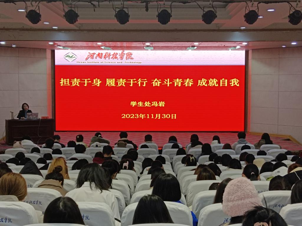 11月30日晚,外国语学院特邀学生处副处长冯岩在图教201为学院2023年“青马工程”培训班暨团学干部培训班学员作“担责于身 履责于行 奋斗青春 成就自我”专题讲座。外国语学院全体班委、寝室长以及团委、学生会全体学生干部等参加此次培训。