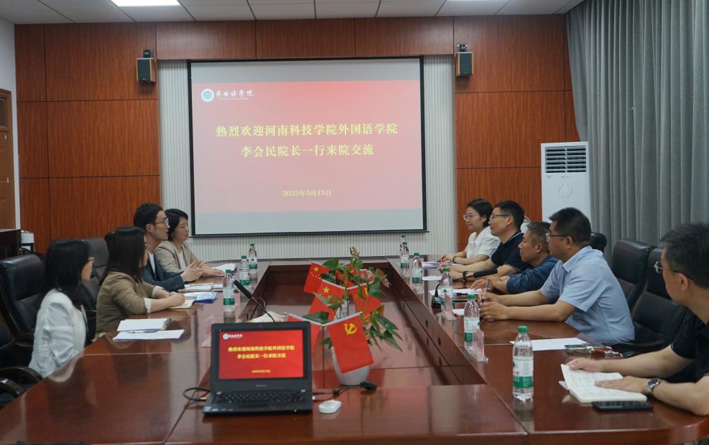 在浙江工业大学外国语学院,院长彭国珍介绍了其“三跨多融合”育人模式、慕课出海特色课程、公共外语特色育人体系等,李会民介绍了我院MTI翻译硕士招生与培养、大学英语教育等方面的情况。接着,双方探讨了英语专业教学改革、大学英语特色教学团队建设、课程优化方案等问题,并计划在师资培训、科研合作等领域开展合作。