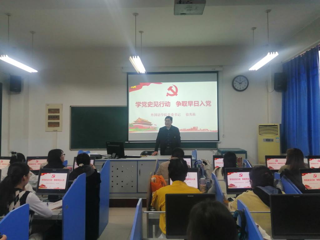 为深入学习贯彻习近平新时代中国特色社会主义思想,贯彻落实发展党员工作有关要求,进一步强化对入党积极分子的理论武装和党性教育,4月9日下午,外国语学院在7304教室举行第52期入党积极分子培训班开班仪式。徐兆栋以《学党史见行动 争取早日入党》为题开讲培训第一课。