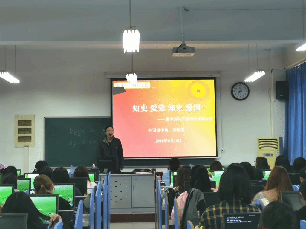 4月14日上午,外国语学院党委副书记龚俊朋以“知史爱党,知史爱国”为主题为全体入党积极分子上了一堂生动的党课。