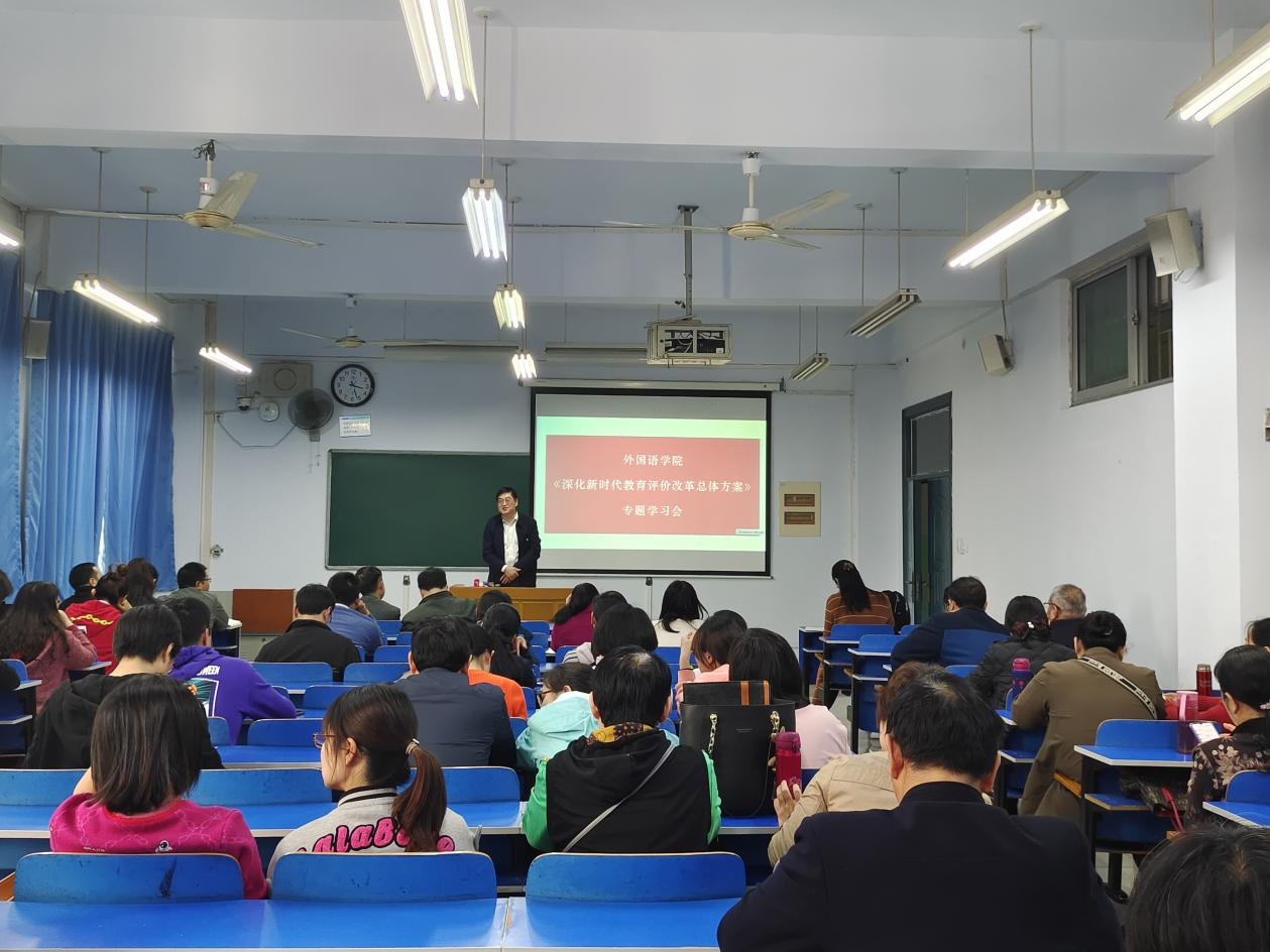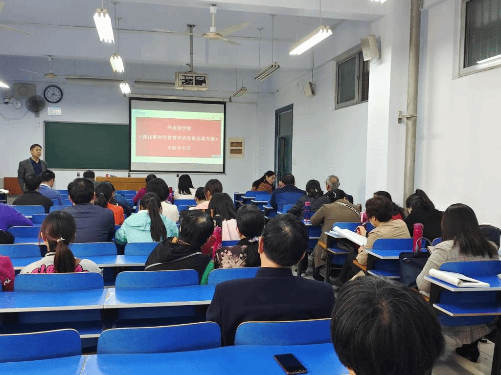 为深入学习贯彻习近平总书记关于深化新时代教育评价改革的重要指示精神,全面落实中共中央、国务院《深化新时代教育评价改革总体方案》。根据学校工作安排要求,4月22日下午,外国语学院组织召开《总体方案》专题学习会。外国语学院全体教职工参加会议。