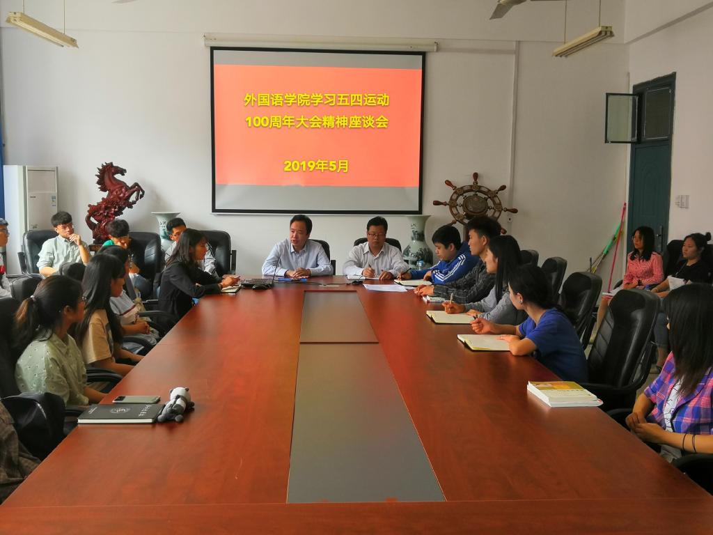 为深入学习贯彻习近平总书记在纪念五四运动100周年大会上的重要讲话精神,激励全院广大青年不忘初心,牢记使命,在新时代展现新作为、作出新贡献。5月10日上午,外国语学院学习五四运动100年周年大会精神座谈会在7211会议室举行。党委副书记龚俊朋,团委书记张高峰,辅导员时文鹏及全体团学干部出席座谈会。