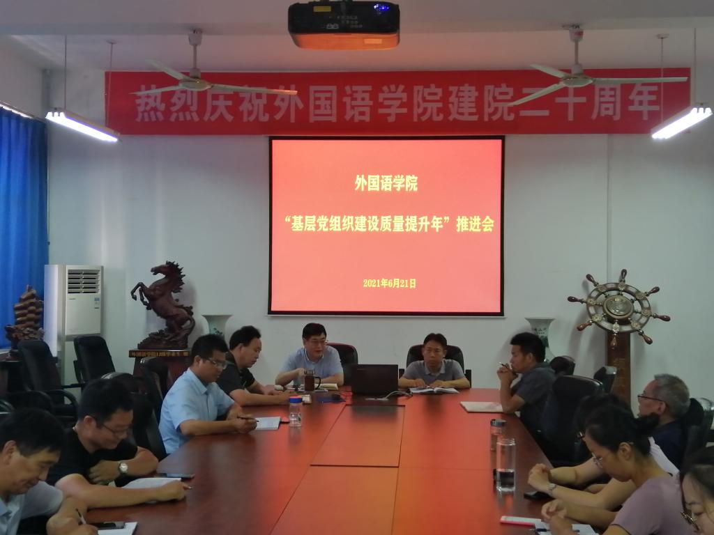 6月21日下午,外国语学院“基层党组织建设质量提升年”活动推进会在学院二楼会议室召开,学院领导班子、党委委员、支部书记及各教研室负责人参加了会议。