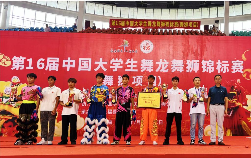 近日,由中国学生体育联合会主办、桂林市永福县人民政府承办的第16届中国大学生舞龙舞狮锦标赛(舞狮项目)在永福县体育馆正式开赛,本次比赛由来自全国43所高等院校的600余名运动员参加。在学校及学院的大力支持下和岳修专、张丰龙老师的带领下,舞狮队共参与了3个项目的竞赛,经过激烈角逐,获得南狮自选套路第3名、南狮规定套路第5名、南狮传统套路第7名的优异成绩。