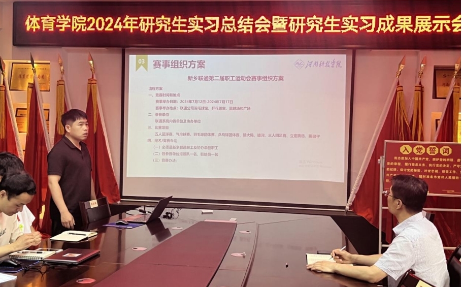 为促进体育硕士的实践能力,根据研究生培养方案要求,学院安排2022级全日制体育硕士赴研究生实习基地实习。6月6日下午,体育学院2022级硕士研究生实习总结会暨实习成果展示会在学院会议室召开。副院长贾洪洲、研究生秘书李景龙出席会议,2022级全日制研究生全部参会。
