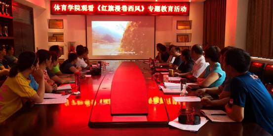 6月27日下午,体育学院在会议室开展观看《红旗漫卷西风》专题教育活动,全体党员参加了此次活动。