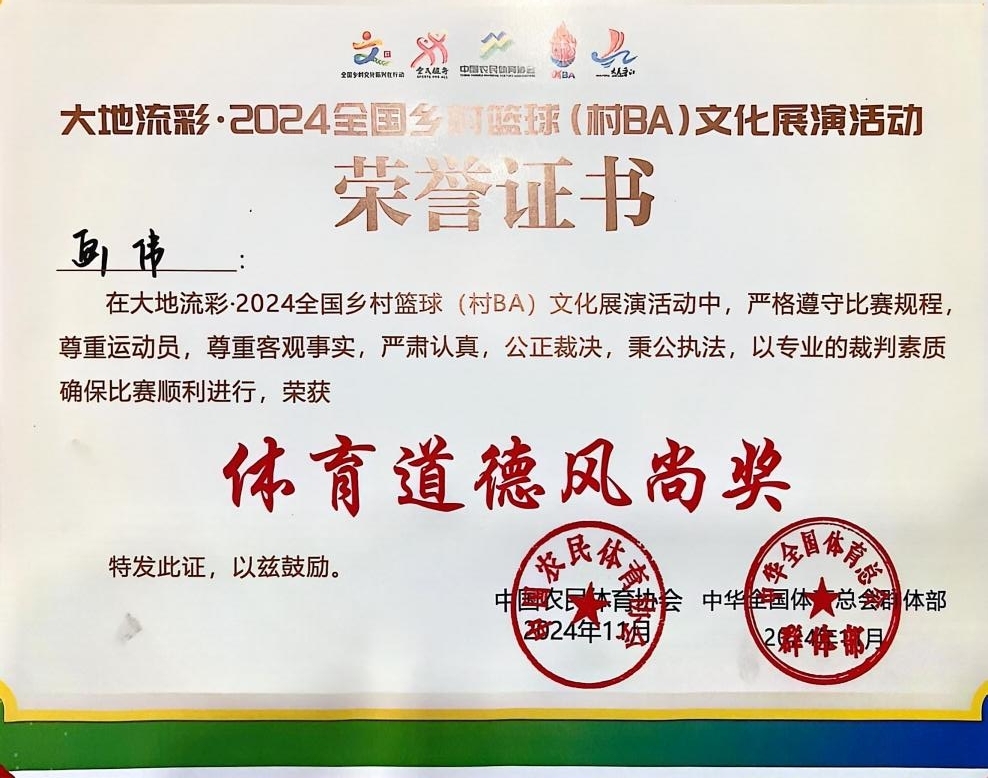 由农业农村部农村社会事业促进司、国家体育总局群众体育司指导,中国农民体育协会、中华全国体育总会群体部主办的“大地流彩·全国乡村文化艺术展演季——全国乡村篮球(村BA)菁英赛”日前在中国农业大学落幕,我院教师画伟完成此次赛事的执裁工作。