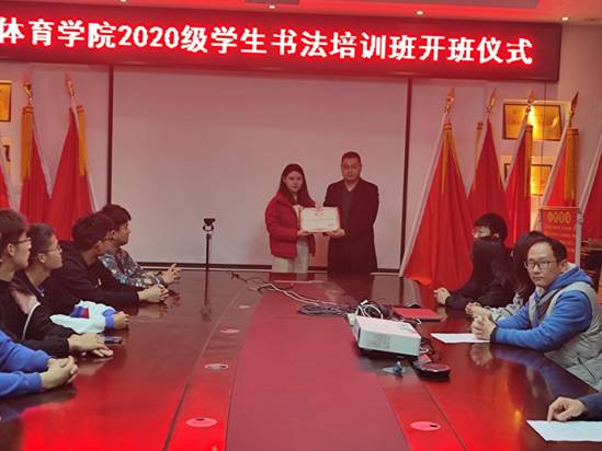 为弘扬国粹,改善我院文化氛围,提高师范类学生审美素质和教学能力,创建我院优良学风,4月1日下午体育学院在会议室举办2020级学生书法培训班开班仪式。党委副书记李志峰、副院长高泳、团委副书记龚婷,书法班特聘教师、艺术学院2017级书法专业学生李丽君,以及2020级体育教育专业学生参加开班式,仪式由李听老师主持。
