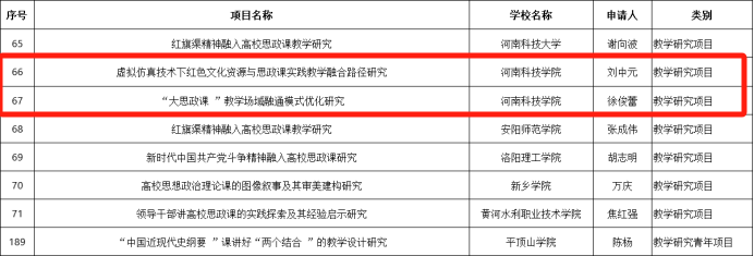 近日,教育部社科司公布了2023年教育部思想政治理论课研究专项评审结果,马克思主义学院刘中元副教授的《虚拟仿真技术下红色文化资源与思政课实践教学融合路径研究》和徐俊蕾副教授的《“大思政课”教学场域融通模式优化研究》两项教学研究项目同时获批,实现了历史性的新突破!此次全国共207个项目获批,河南高校8个项目入选,而我院同时获批2项,在河南省高校中拔得头筹。