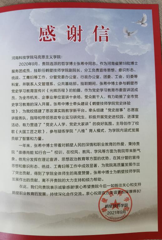 会上,璩凤英为我院赠送感谢信,感谢学院选派的挂职博士张希中为鹤壁技师学院作出的贡献。随后,双方就党建、研究生培养、思政课改革创新等工作等进行了深入交流。