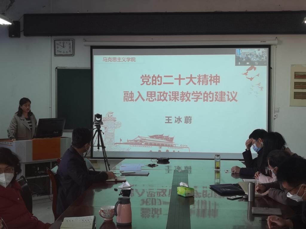 1月6日上午,马克思主义学院党总支在8#508会议室以线上线下相结合的形式开展“党的二十大精神”理论宣讲活动,院长王冰蔚以“党的二十大精神融入思政课教学的建议”为题,为全体党员深入解读党的二十大精神。