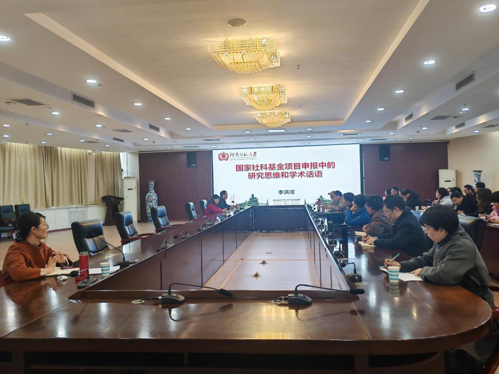 此次论证会邀请的专家是河南师范大学政治与管理学院院长李洪河教授。李洪河教授首先作了题为《国家社科基金项目申报中的研究思维和学术话语》的报告。在报告中,李洪河教授结合自身学术研究经历,分析了近年来国家社科基金立项的重点领域,剖析了国家社科基金项目申报中的学术话语,从凝练选题、把握综述、创新内容、研究思路、撰写规范等方面阐释了国家社科基金项目申报中的研究思维和学术话语。接下来,李洪河教授对我院拟申报国家社科项目的8名教师的申报选题逐一进行了点评,并结合一些申报成功的案例对申报书的论证和填写规范进行了精准指导。