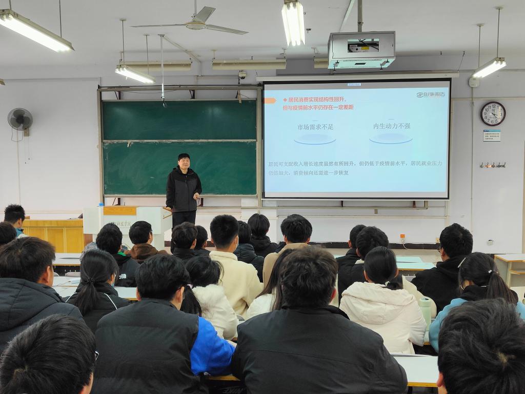 张亮老师以“中国经济‘形’稳‘势’升”为题,对疫情后中国经济的运行进行了解读,引导学生看准当前的“形”,看清长远的“势”,明晰我国经济韧性十足、前景光明。张亮老师十分注重学生辩证思维的培养,结合学生实际,采取通俗易懂的教学案例,对于知识点进行了深入浅出的分析,与同学们进行了精彩的交流互动,课堂教学实现了知识传授、思政教育和价值引领的有机统一。
