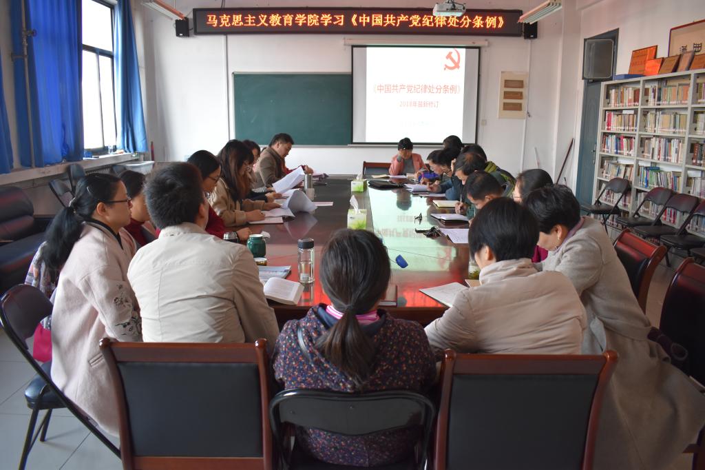 11月8日下午,马克思主义教育学院召开专题学习会议,就“以案促改”警示教育和新修订的《中国共产党纪律处分条例》进行解读学习。学院全体教职工参加了此次学习会议,会议由学院院长兼党总支副书记王冰蔚主持。