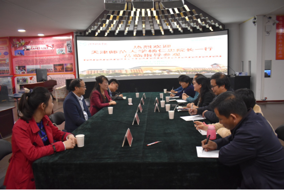 李靖对我院的热情接待表示感谢,并介绍了天津师范大学马克思主义学院的基本情况和改革经验,为我院下一步的发展传经送宝。杨仁忠对我院国情国史体验馆建设和思想政治理论课实践教学改革给予了高度评价,认为我院思政课校内实践教学及平台建设特色鲜明,成绩突出,是对思政课实践教学模式的有益探索和开拓创新。