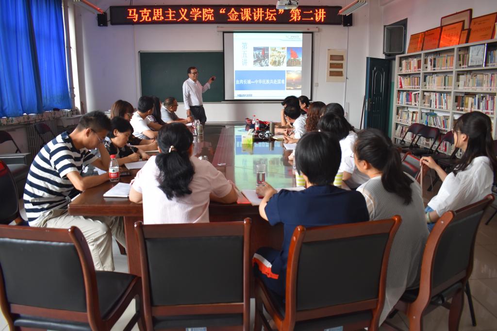 为贯彻习近平总书记在全国思政课教师座谈会上的讲话,建设大学生真心喜爱、终身受益的思政课,马克思主义学院于2019年5月23日下午3点,在8号教学楼508会议室举行了思想政治理论课“金课论坛”第二讲,主讲人为赵东喜老师,教学副院长孙喜英主持,学院全体教工聆听了报告。