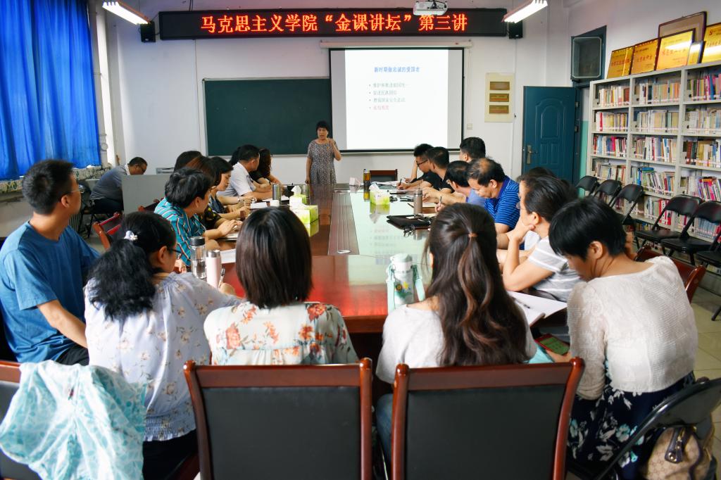 为更好的贯彻习近平总书记在全国思政课教师座谈会上的讲话,帮助大学生扣好人生的第一粒纽扣,建设大学生真心喜爱、终身受益的思政课,马克思主义学院于2019年6月6日下午3点,在8号教学楼508会议室举行了思想政治理论课“金课论坛”第三讲,主讲人为赵元明老师,教学副院长孙喜英主持,学院全体教工聆听了报告。