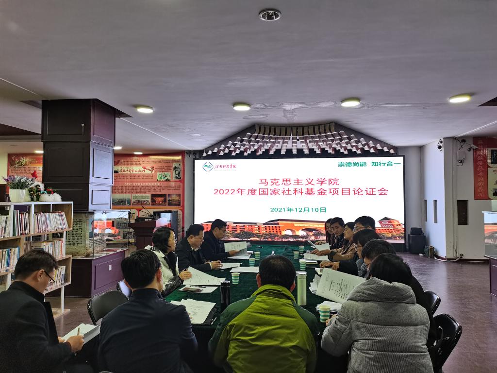 为做好2022年国家社科基金申报工作,切实提高项目申报质量,12月10日下午,我院在国情国史体验馆举办国家社科基金申报论证会,特别邀请河南师范大学博士生导师马福运教授,新乡医学院马克思主义学院院长戎华刚教授,科技处副处长毕昱文博士到会指导。会议由马克思主义学院院长王冰蔚教授主持,学院党政领导以及申报课题教师和学术团队成员参加。