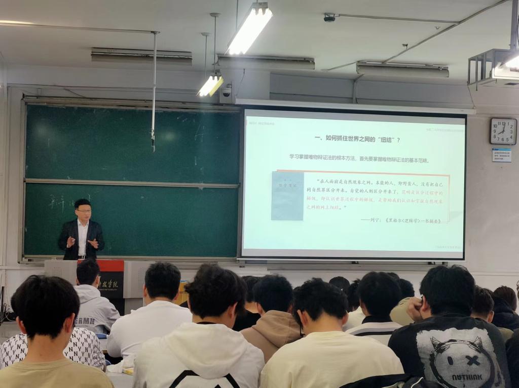 尹璐老师以“辩证法五大范畴”为主题,综合运用系统讲授法、案例教学法等教学方法,深刻阐释了“内容与形式、本质与现象、原因与结果、必然与偶然、现实与可能”之间的辩证关系及方法论意义。授课中,尹老师紧扣教学目标,采用通俗易懂的教学案例使抽象的哲学理论更加具象化,同时注重学生辩证思维的培养,实现了知识传授、思政教育和价值引领的有机统一,为我们呈现了一节有理论深度、实践力度和情感温度的思政课。
