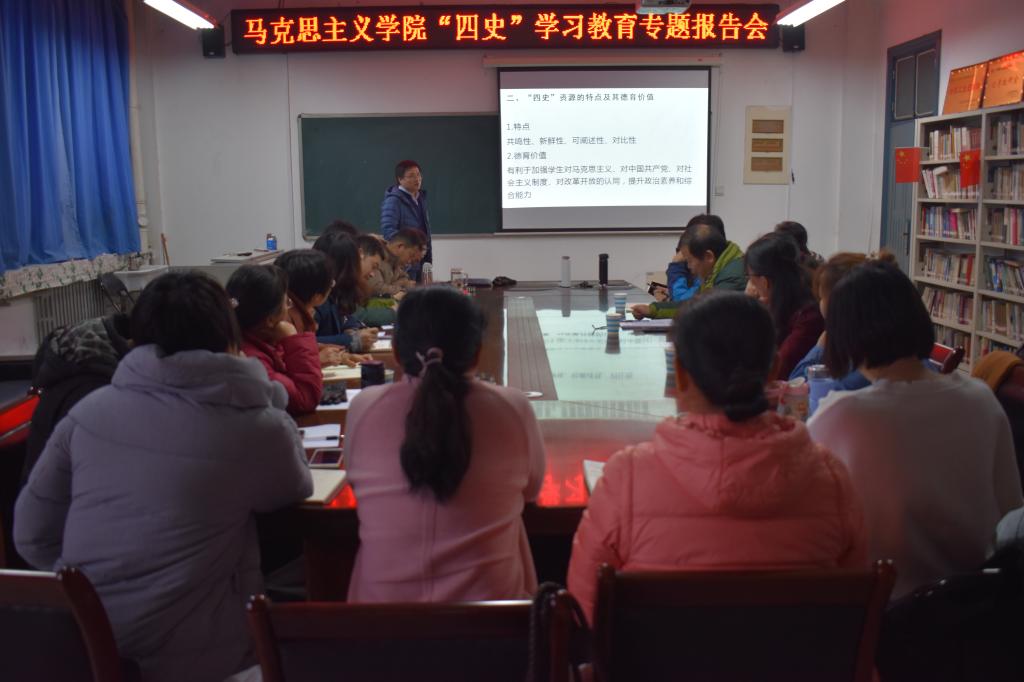 为深入学习贯彻习近平总书记关于“四史”学习重要指示精神,进一步将学习“四史”推向深入,按照学校关于开展“四史”学习教育活动的要求,12月10日下午,马克思主义学院举行了“四史”学习教育专题报告会。学院硕士生导师王鑫宏博士作题为《“四史”资源融入思政课教学的思考》的专题报告。报告会由学院副院长刘中元主持,学院全体教师参加了会议。