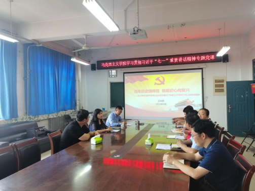 9月23日下午,马克思主义学院举行学习贯彻习近平“七一”重要讲话精神专题党课,院长王冰蔚以“百年历史铸辉煌 砥砺初心向复兴”为题,对习近平总书记“七一”重要讲话精神进行了专题讲授。学院班子成员、各教研室主任和党支部书记参加了本次党课。