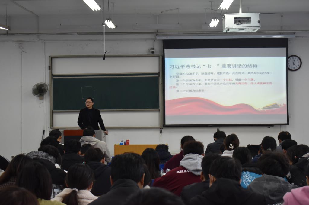 为持续深入推进党史学习教育,进一步提升广大教师教育教学水平,引导教职工和青年学生知史爱党、知史爱国,11月11日上午,马克思主义学院在8号楼合四教室举行本学期第二次党史学习教育公开课。本次公开课由费渔林老师主讲,全体教师集中观摩了课程。