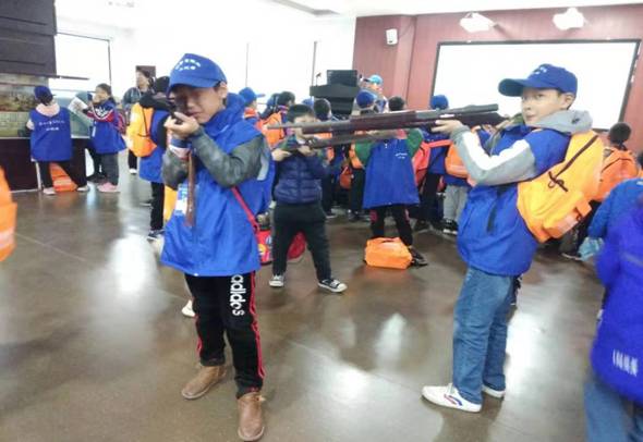 在馆内服装道具旁,小记者们的热情更高,纷纷拿起仿制刀、枪、手榴弹等,戴上军帽,模拟打仗情景,体验馆的老师们问孩子们:“过去红军打仗武器那么落后,为什么最后还是胜利了?”引导孩子们思考一切为了人民,一切依靠人民,就能得到人民的支持,就能打胜仗,永远不忘人民路线。