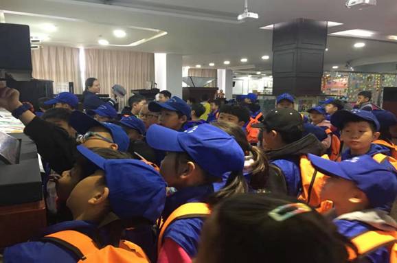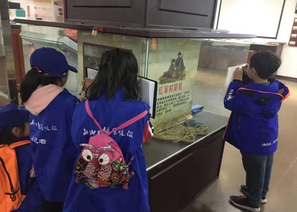 小记者们在老师的带领下,分4批来到体验馆,对馆内的系列《长针漫画故事》、学生们的作品、橱窗里的草鞋、马灯等展品非常感兴趣,认真地看,认真地做笔记,体验馆的老师们也不失时机地对孩子们进行爱党爱国的教育。