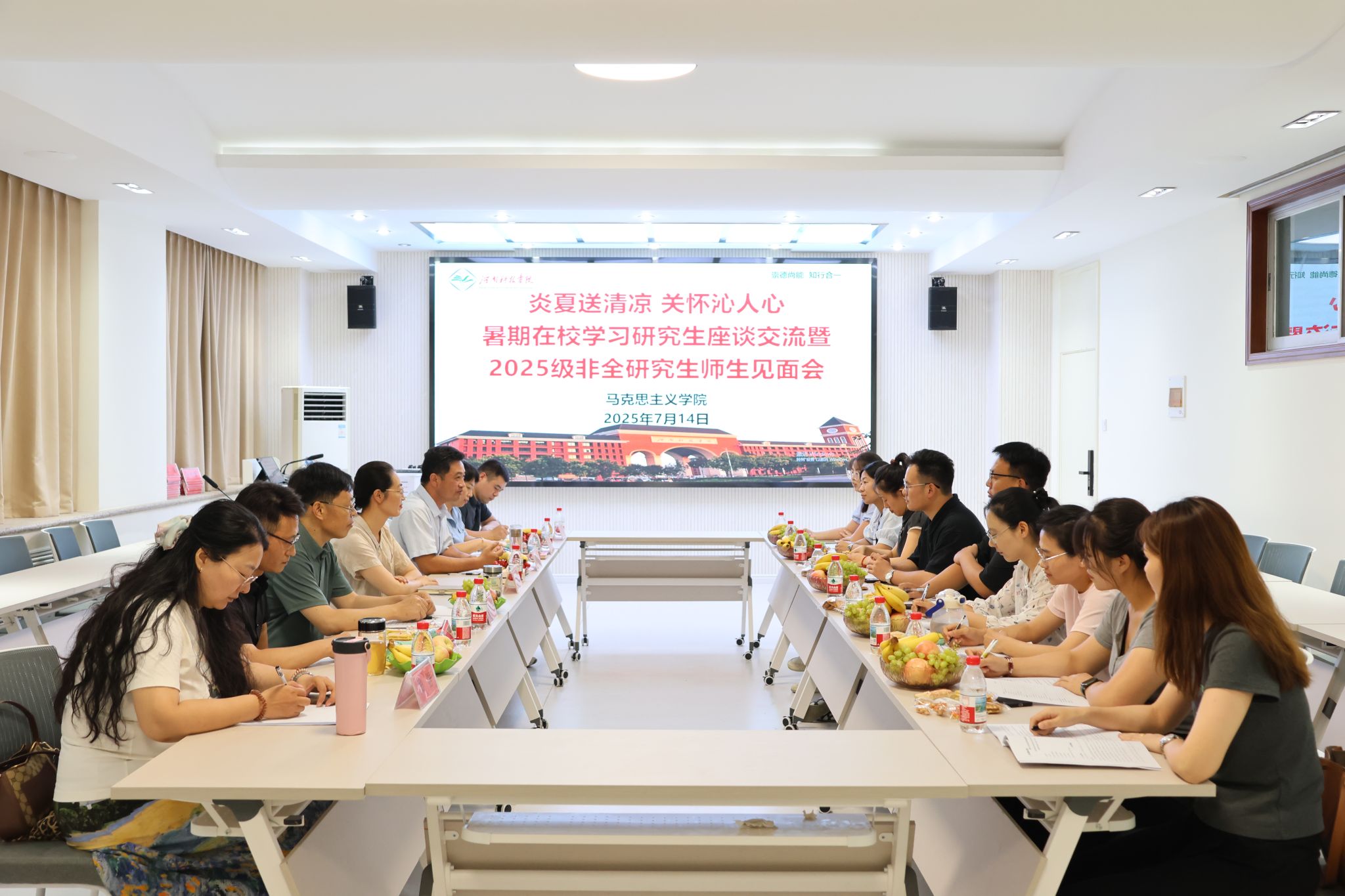 为深入了解暑期在校研究生的学习生活情况,在炎炎夏日为同学们送去关心和慰问,7月14日晚,马克思主义学院在0号楼809会议室开展暑期在校学习研究生座谈慰问活动。学院党委书记吴玲玲、党委副书记刘中元、副院长张希中、张雪霞出席活动,导师代表、研究生秘书、研究生辅导员以及暑期在校学习的非全日制研究生参加座谈。活动由刘中元主持。