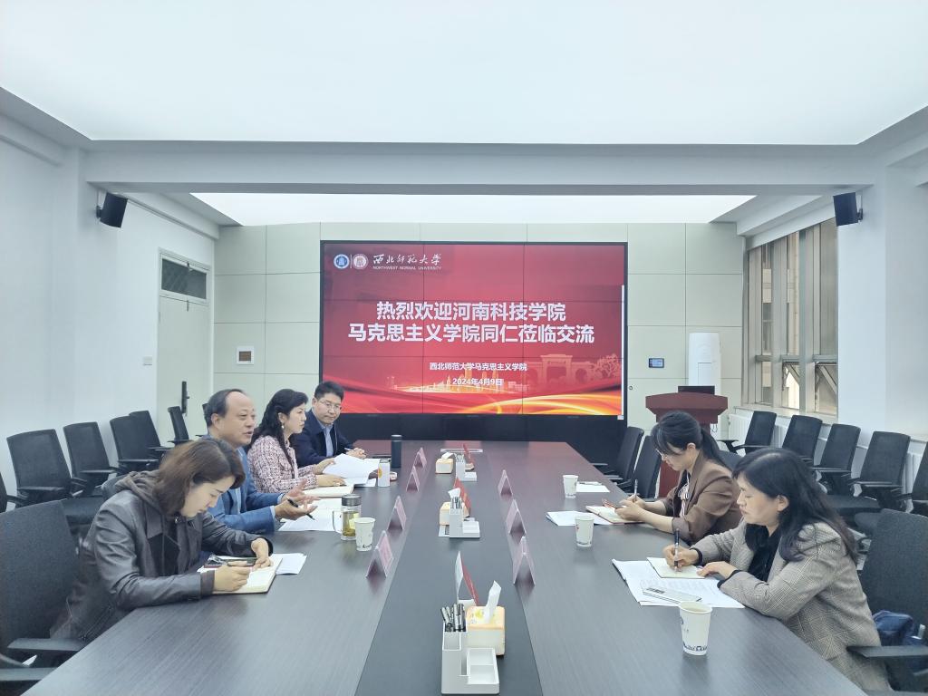 在西北师范大学马克思主义学院,刘德雄书记对我院的到访表示热烈欢迎,并介绍了学校的基本情况和学院的办学历史。王宏渊副书记分享了“大思政课”建设的情况与经验。副院长马乔恩、周方、韩璐分别介绍了学科建设、科学研究、智库建设、文献资源建设、大中小学思政课一体化建设以及思政课实践教学等方面的情况和取得的成效。我院吴玲玲和王冰蔚分别介绍了学校和学院的基本情况,并分享了他们在青年教师培养、思政课实践教学改革和社会服务方面的经验和做法。