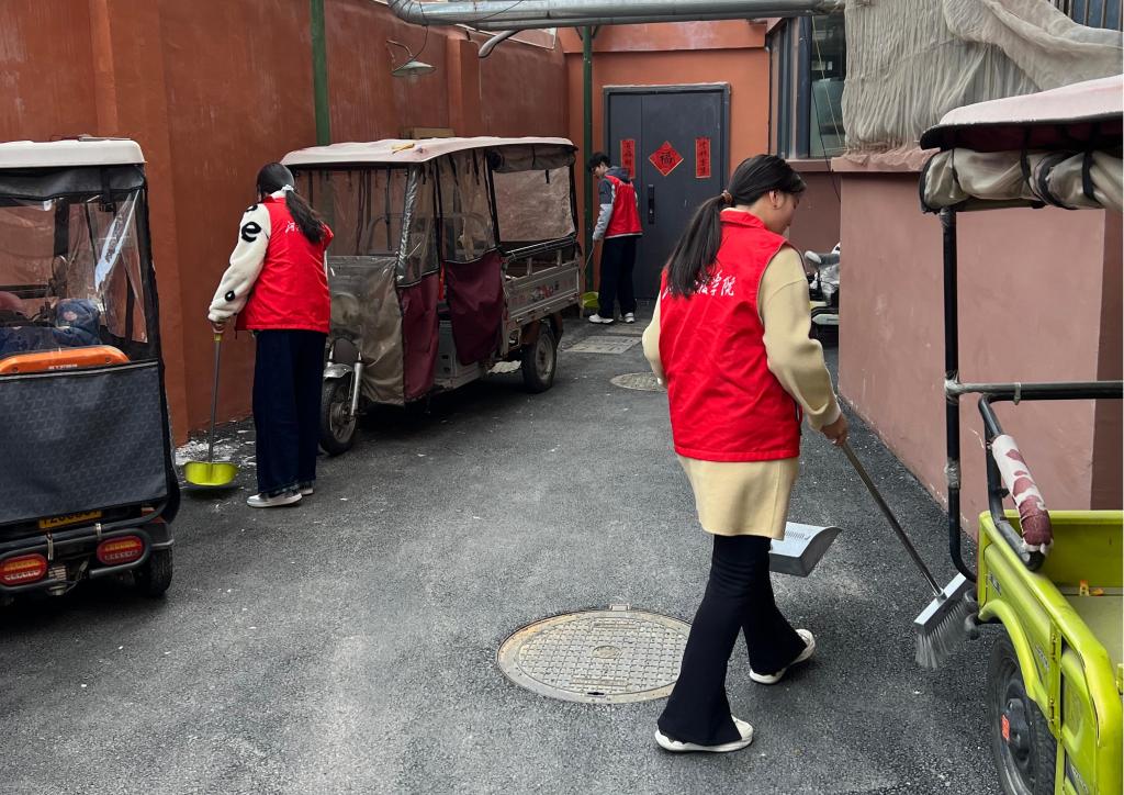 随后,大家前往黄河口社区开展环境清洁志愿服务。一到社区,大家便拿出提前备好的劳动工具投入工作。师生齐心协力清扫路面落叶、烟头、纸屑和白色垃圾,积极向围观协助的居民宣传志愿活动缘由和保护环境的重要性。