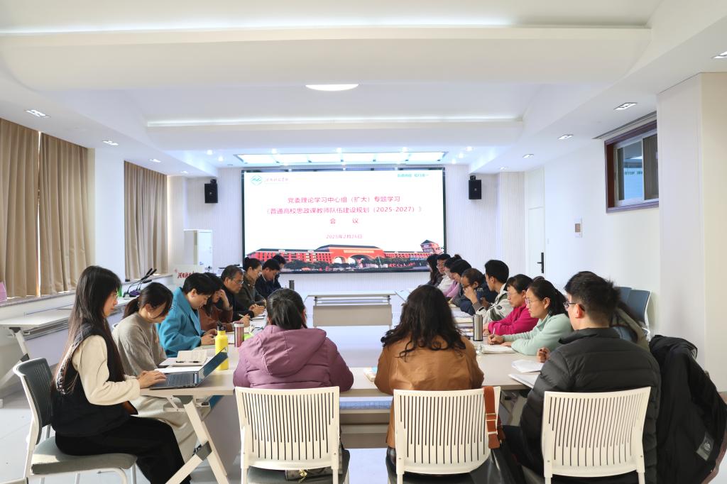 2月26日下午,马克思主义学院党委在0#809会议室召开理论学习中心组(扩大)会议,专题学习中央教育工作领导小组秘书组印发的《普通高校思政课教师队伍建设规划(2025-2027年)》(以下简称《规划》)。学院党委委员、支部书记、教研室主任等20余人参加学习会。