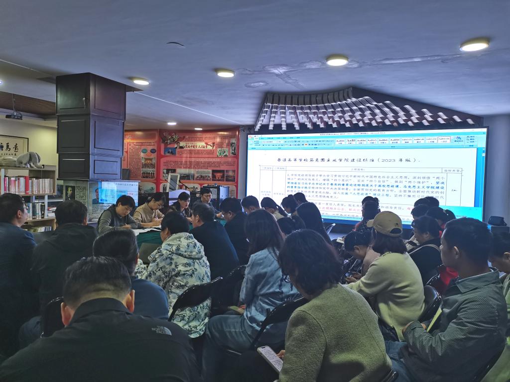 为进一步建强建好马克思主义学院,不断提升马克思主义学院建设的科学化、规范化、现代化水平,打造马克思主义理论教育教学、研究、宣传和人才培养的坚强阵地,11月3日下午,马克思主义学院在国情国史体验馆召开专题会议,学习研讨教育部印发的《普通高等学校马克思主义学院建设标准》(2023版)【教社科〔2023〕1 号】。会议由副院长张希中主持,学院党政班子成员和全体教师参加了学习会。