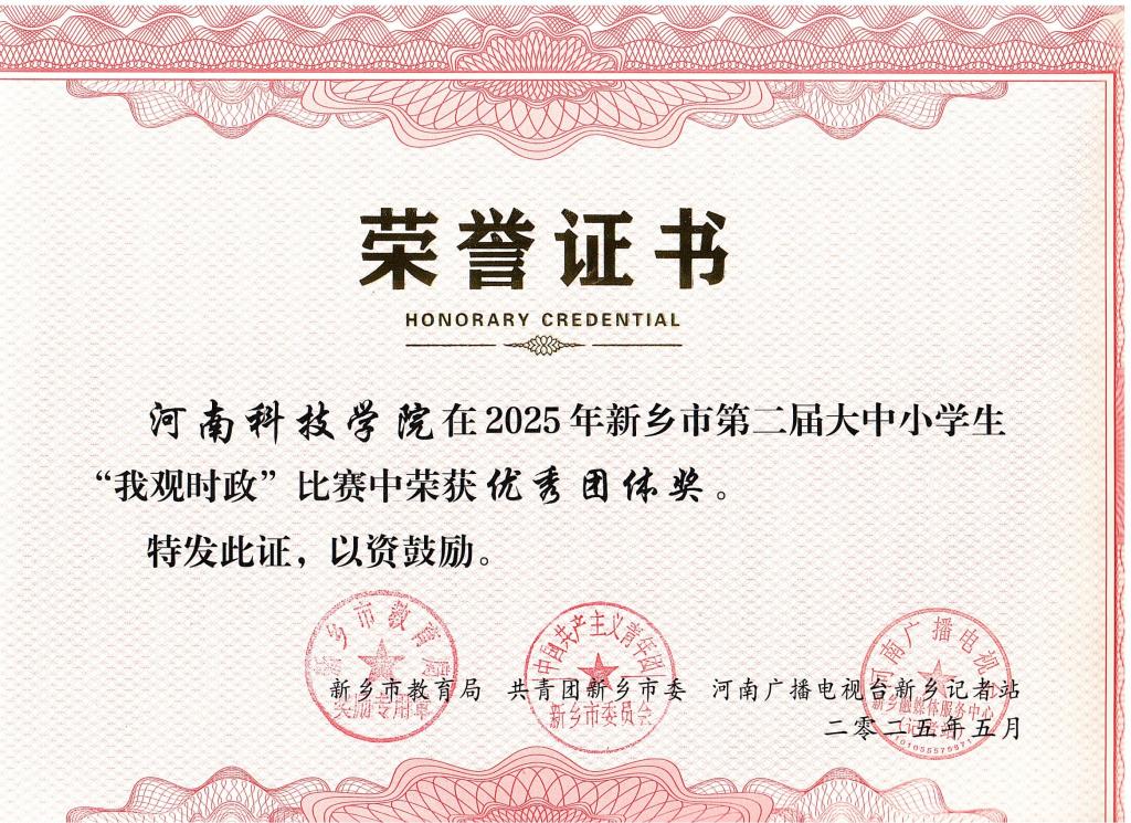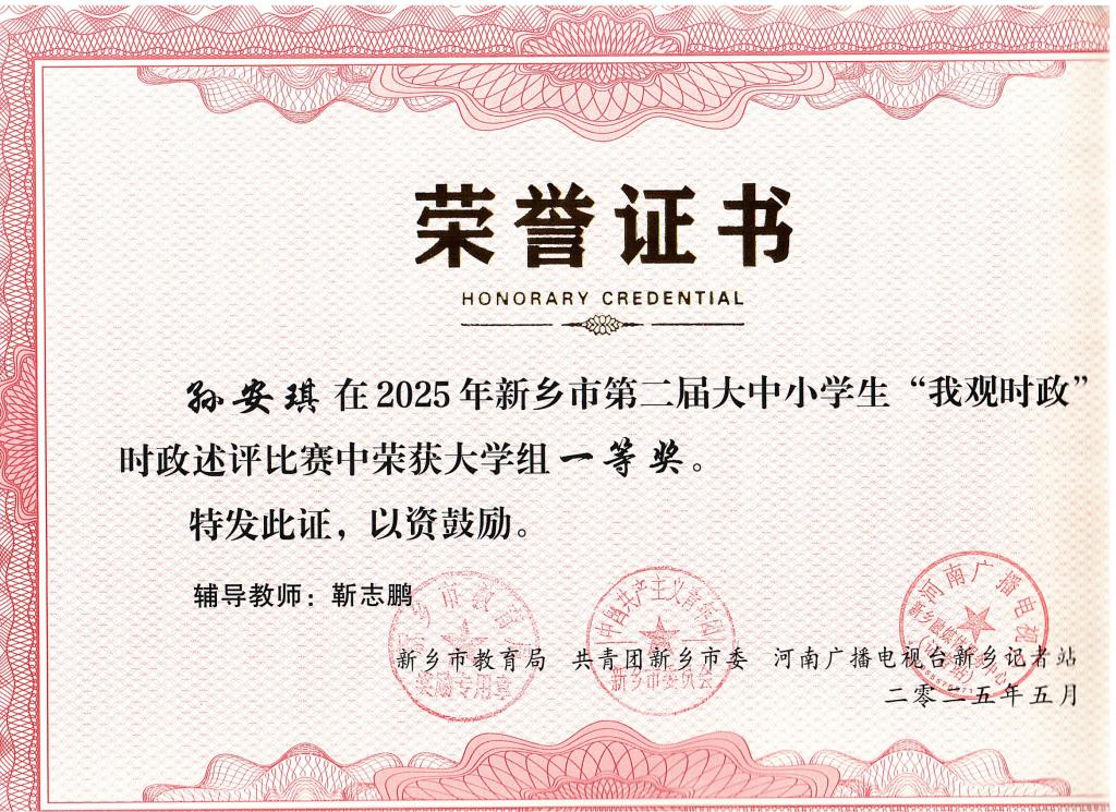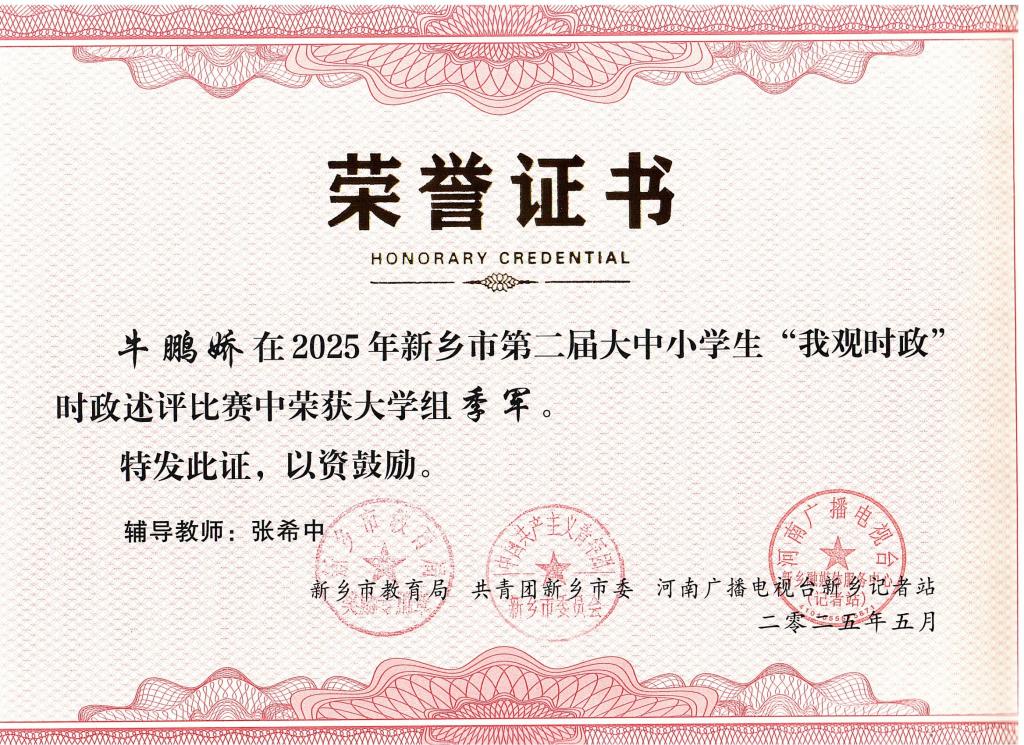 近日,由新乡市教育局、共青团新乡市委和河南广播电视台新乡记者站联合举办的新乡市第二届大中小学生“我观时政”比赛落下帷幕。我校《习近平新时代中国特色社会主义思想概论》课程团队经过初赛推选出的学生牛鹏娇、孙安琪在比赛中表现突出,分别获得第三名(季军)和第五名的优异成绩,学校荣获优秀团体奖。