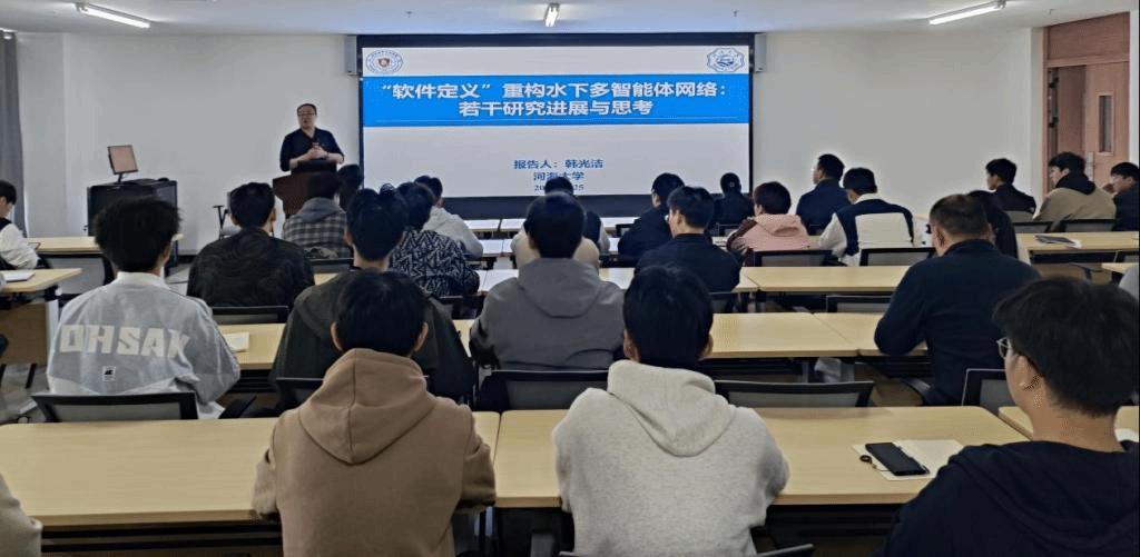随后,韩光洁在弘德楼B310作了题为《“软件定义”重构水下多智能体网络:若干研究进展与思考》的学术报告,学院党政班子成员、教师和研发团队骨干参加了报告会。报告会由人工智能学院院长蔡磊教授主持。