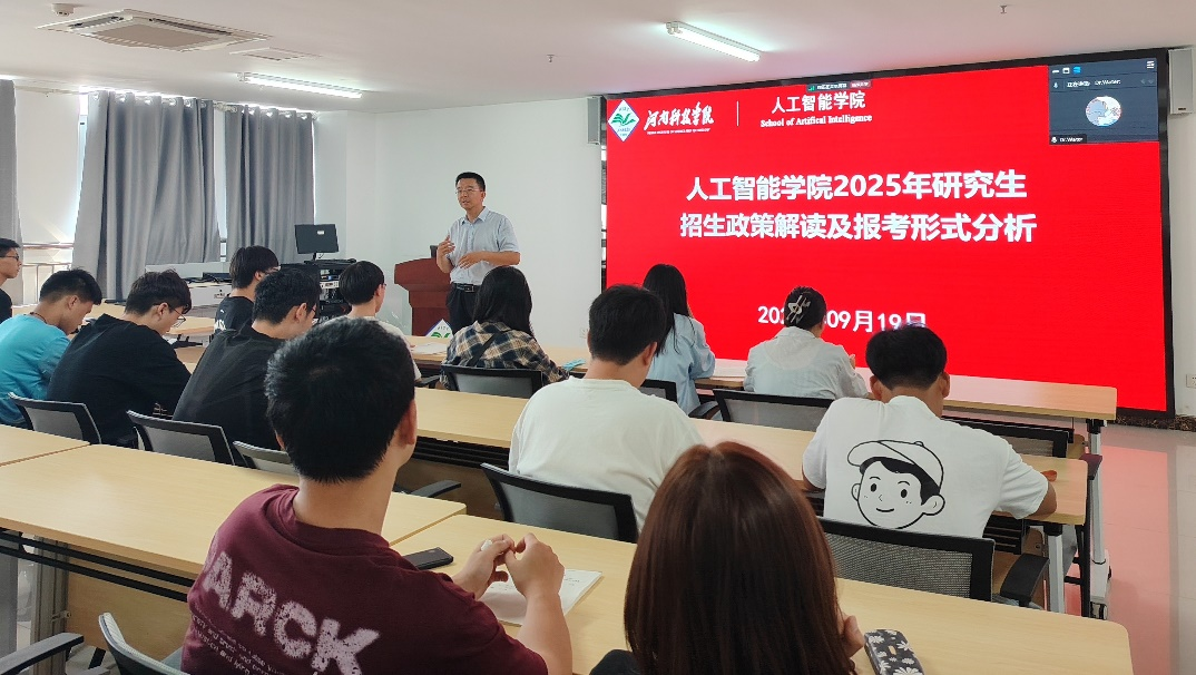 为帮助2025届本科毕业生合理规划学业,提升学生的考研竞争力,9月19日下午,人工智能学院在弘德楼B310召开了2025年研究生招生政策解读及报考形势分析宣讲会,会议采用线上线下相结合的形式进行。人工智能学院副院长徐涛、研究生秘书宋林森及2025届全体本科毕业生参加了会议。