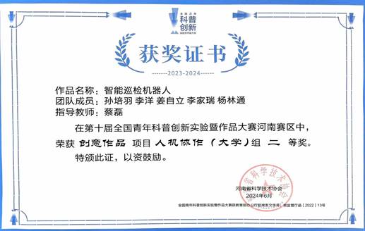 5月23日,由河南省科协主办的第十届全国青年科普创新实验暨作品大赛河南赛区复赛在郑州市圆满结束。人工智能学院孙培羽等5位同学经过精心准备、层层选拔,参赛作品“智能巡检机器人”荣获创意作品项目人机协作(大学)组二等奖。青年科普创新实验暨作品大赛是教育部批准的全国性竟赛活动之一,本届大赛旨在聚焦“智慧·安全·环保”三大主题,鼓励青少年发挥创新精神,将科学知识转化为实际应用。