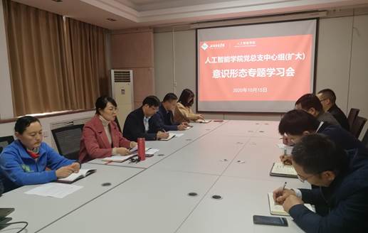 10月15日下午,人工智能学院在0#803会议室举行党总支中心组(扩大)意识形态工作专题学习会。学院总支委员及全体教职工参加学习会。学习会由党总支书记吴玲玲主持。